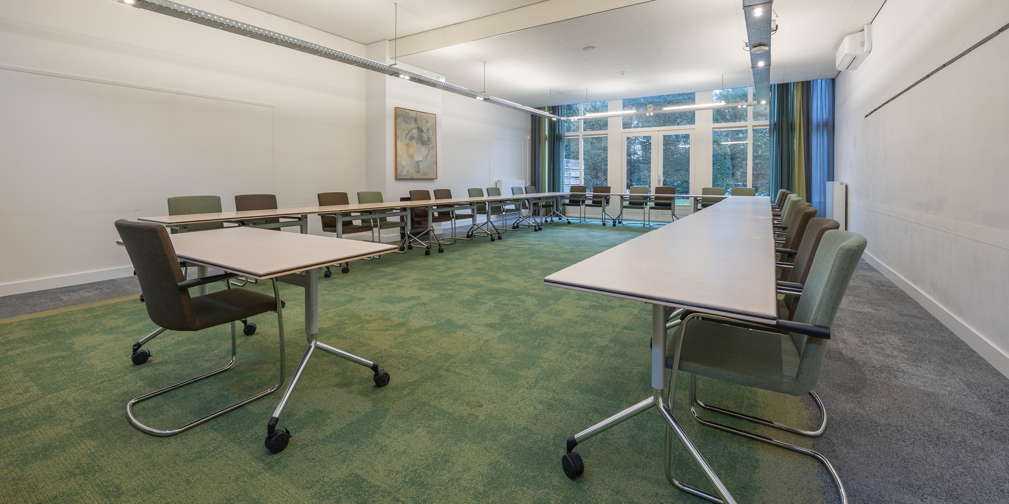 De Schoutenzaal is een fijne, energieke ruimte met een eigen terras. En dus is het ook mogelijk uw vergadering of bijeenkomst voort te zetten in de frisse buitenlucht.